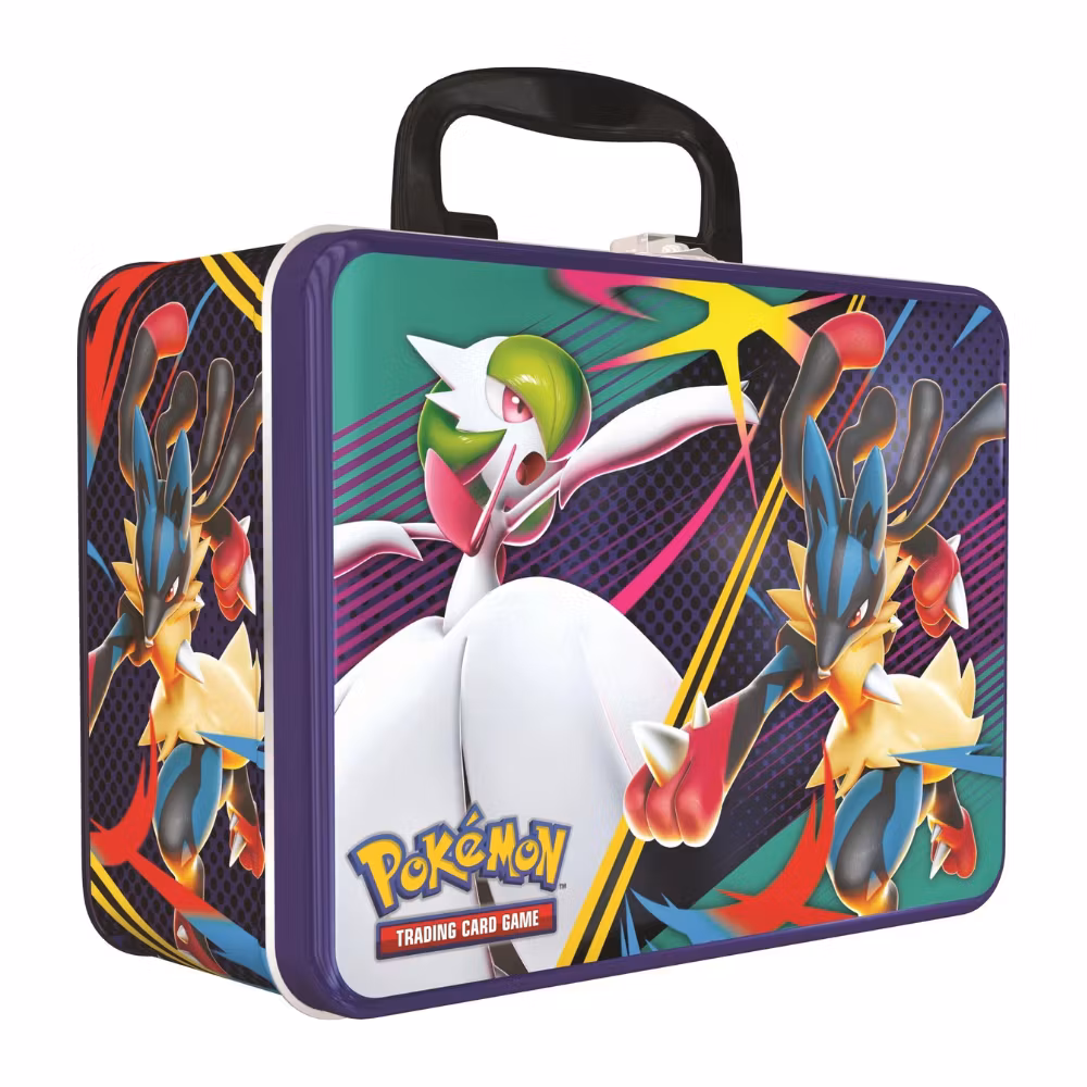 Pokémon Trading Card Game: Collector Chest innehåller: • 6 Pokémon TCG booster packs. • 3 foil kort med Ralts, Kirlia och Riolu. • 1 Pokémon mynt med Mega Lucario • 4 färgglada häften med klistermärken. • En mini portfolio att förvara dina favoritkort. • Ett kodkort till Pokémon TCG Live.