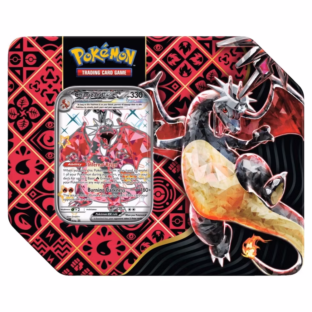 Se den hisnande kraften hos Shiny Pokémon-ex som överskrider gränserna för tid och typ! Med denna burk, välj den skakande kraften från Great Tusk ex som en uråldrig Pokémon, den järnklädda beslutsamheten av Iron Treads ex som en Future Pokémon, eller den brinnande andan hos Charizard ex som en Tera Pokémon av Darkness-typ. Upptäck sedan ännu fler fantastiska kort i Scarlet & Violet-Paldean Fates booster-paket!