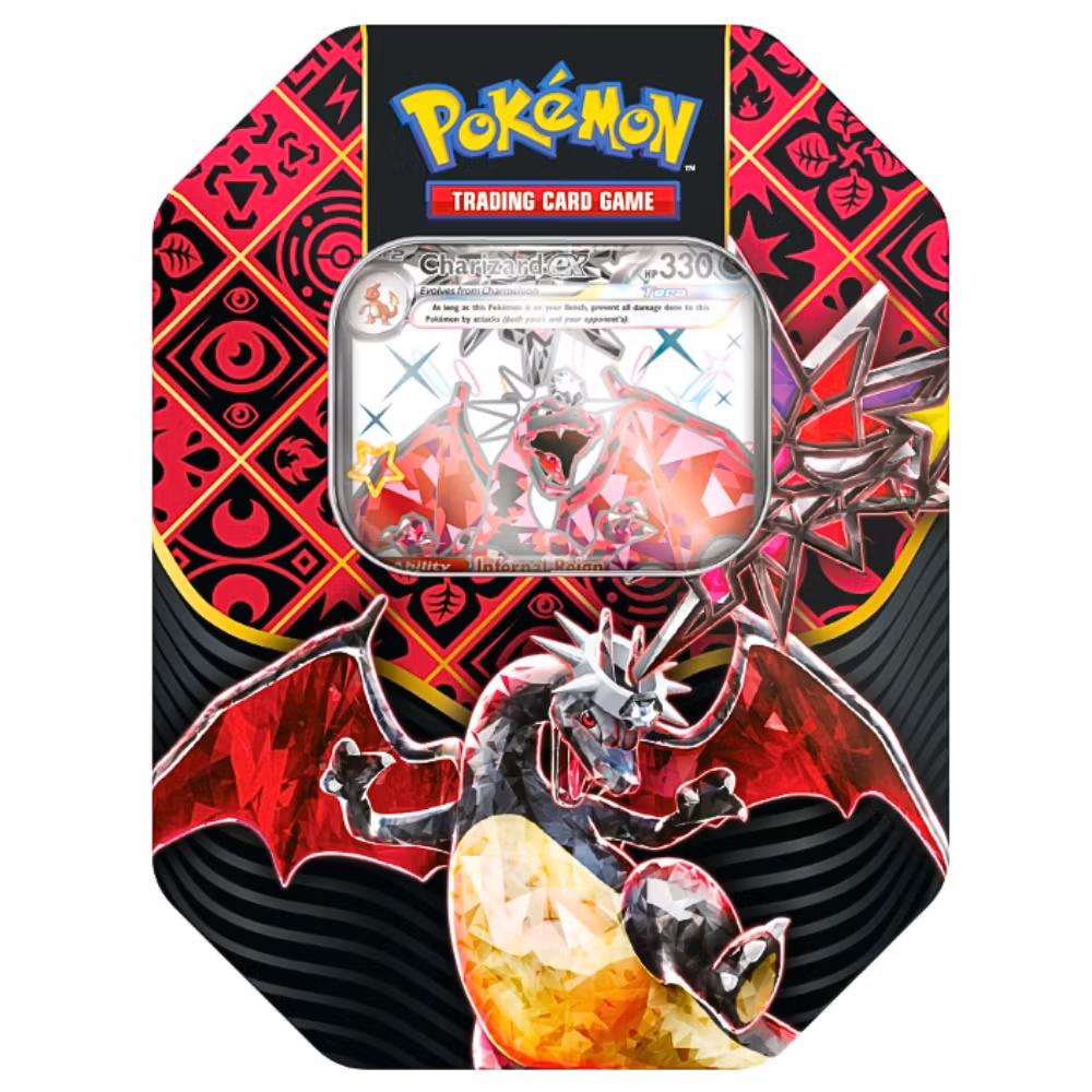 Se den hisnande kraften hos Shiny Pokémon-ex som överskrider gränserna för tid och typ! Med denna burk, välj den skakande kraften från Great Tusk ex som en uråldrig Pokémon, den järnklädda beslutsamheten av Iron Treads ex som en Future Pokémon, eller den brinnande andan hos charizard ex som en Tera Pokémon av Darkness-typ. Upptäck sedan ännu fler fantastiska kort i Scarlet & Violet-Paldean Fates booster-paket!